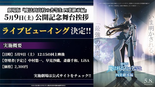 5月9日(土)『劇場版 魔法科高校の劣等生 四葉継承編』公開記念舞台挨拶の模様をOSシネマズにて生中継いたします。